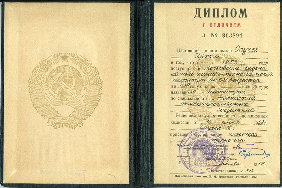 V Moskvě jsem absolvoval Chemicko technologický institut D. I. Mendělejeva. Původně jsem měl studovat výbušniny, což byla specializace č. 34 na fakultě č. 136, jakožto tajné specializace. Já jsem si na třetím ročníku specializaci změnil a studoval jsem vysokomolekulární látky s užší specializací – organokřemičitou chemii (silikony).