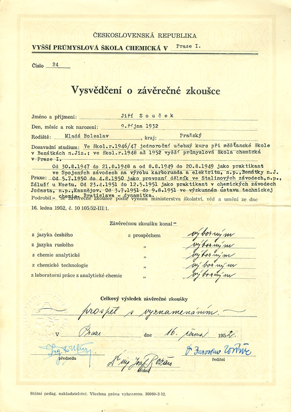 Všechny ročníky jsem zakončil s výborným prospěchem ze všech předmětů. Byl jsem jediný z cca 100 žáků tří paralelních tříd.