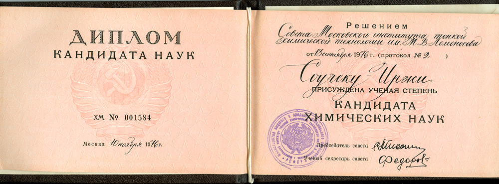 Zahrnuje období 1971–1976, kdy jsem pracoval v Sekretariátě RVHP v Moskvě jako expert v odboru chemického průmyslu a současně absolvoval externí aspiranturu v Lomonosově institutu lehké chemie v Moskvě a část experimentální práce jsem dělal v Ústavu teoretických základů chemické techniky ČSAV v Praze. V disertační práci jsem řešil tuto problematiku: